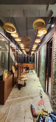 Gia công và lắp đặt vật liệu tre, mây cho hệ thống trang trí trần và vách ngăn. Đây là điểm nhấn tạo nên bản sắc riêng, mang lại cảm giác gần gũi, truyền thống cho không gian